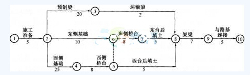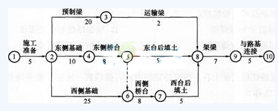 此题考查对桥台施工先后顺序的调整。在桥台的施工模板仅有一套的条件下,应通过合理组织施工来缩短工期,因为西侧桥台基础为桩基础,施工时间长 (25天),而东侧桥台为扩大基础,施工时间短(10天),所以应将原计划中西侧桥台施工完成后再施工东侧桥台,改为在东侧基础施工完毕后,组织施工东侧桥台,东侧桥台施工完成后再施工西侧桥台,这样改变一下组织方式,如图所示。可以将该计划的计划工期缩短到Tc=55天,小于要求工期Tr=60天,也不需增加费用。