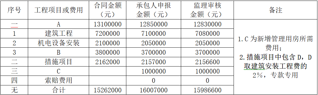 【问题】指出表中A,B,C,D分别代表的工程项目或费用或名称。