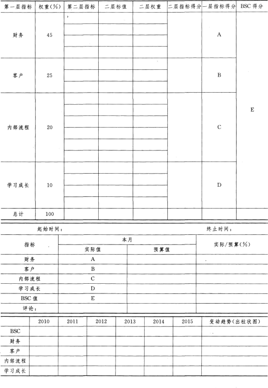 第三步数据分析,将第二步求得的分值做逐年统计,得到变动趋势,出柱状图;同时注意考察一些关键指标,尤其是波动较大的第一层指标,从而制定阶段性工作重点。对于某些指标,如竞争对手数据较难得到,平衡计分卡的运用还是需要其他方法作为配合。