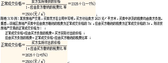 例:某宗房地产交易,买卖双方在合同中写明,买方付给卖方2325元/平方米,买卖中涉及的税费均由买方负担。据悉,该地区房地产买卖中应由卖方缴纳的税费为正常成交价格的7%,应由买方缴纳的税费为正常成交价格的5%。则该宗房地产交易的正常成交价格为: