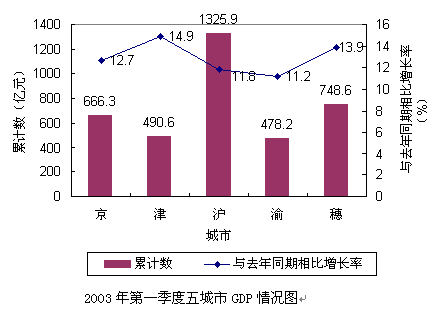 Ⅰ.2003年第一季度五个城市的GDP总量均实现了两位数增长