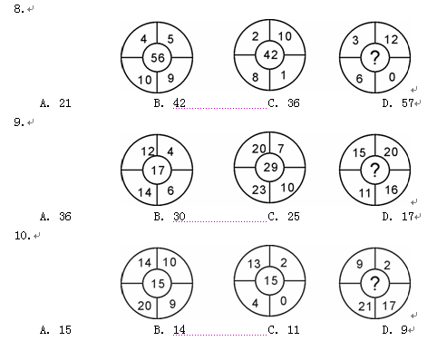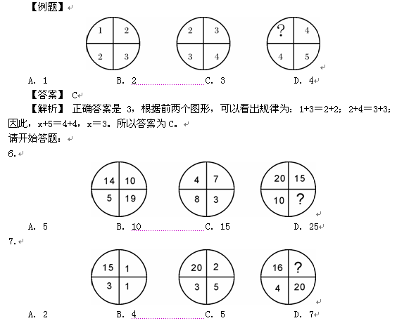 (二)每题图形中的数字都包含一定的规律,请你总结前两个图形中数字的规律,从四个选项中选出你认为问号应该代表的数字。