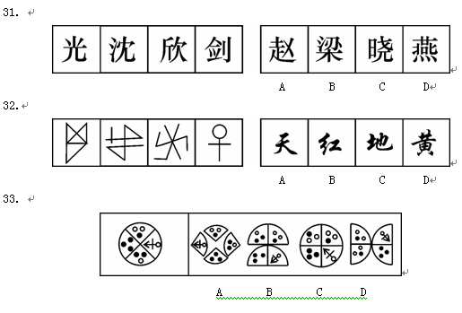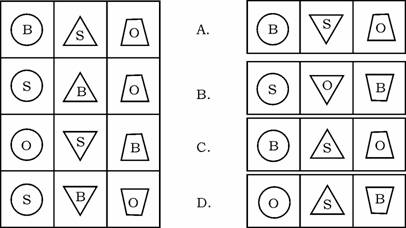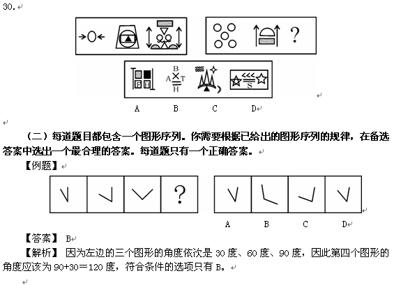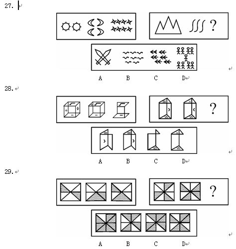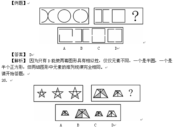 (一)每道题包含两套图形和可供选择的4个图形。这两套图形具有某种相似性,也存在某种差异。要求你从四个选项中选择你认为最适合取代问号的一个。正确的答案应不仅使两套图形表现出最大的相似性,而且使第二套图形也表现出自己的特征。