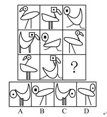 答案:B。解析:每一行构成3只鸟的基本图形元素相同,但是组合不同。所以,依据这一规律,选B。