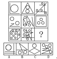 答案:B。解析:每一行、每一列的图形中,圆圈数都比其中的线条数少1.所以,依据这一规律,选B。