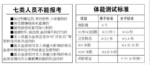 记者从省人事厅获悉,2009年全省公务员招考报考人民警察条件和体能测试标准今日公布。据悉,有犯罪嫌疑尚未查清、曾被辞退或者开除公职等七类人员将不能报考此次招考的公安人民警察职位。体能测评两项不达标的将视体能测评不合格,不予录取。