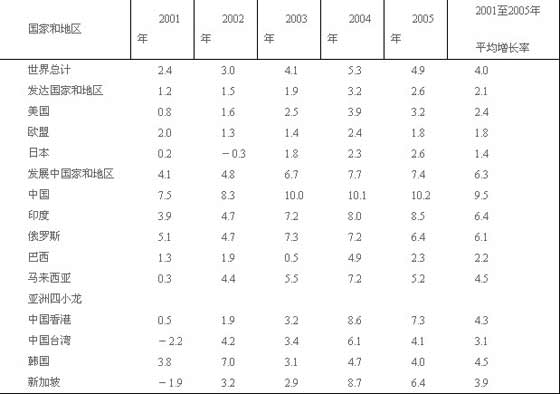 表1:2001至2005年世界主要国家和地区经济增长率比较(%)