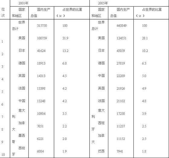 表2:2001至2005年国内生产总值居世界前10位国家比较(亿美元)
