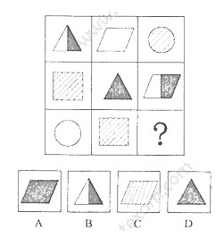 【解答】本题正确答案为D。9个图形从上至下从左至右的图形依次为三角形、平行四边形、圆形和长方形,且每个图形内的花纹与其上下左右的图形全异。故答案为D。