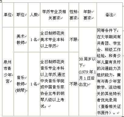 根据中共泉州市委组织部、市人事局《关于市属事业单位补充工作人员实行考试考核公开招聘有关问题的通知》精神,共青团泉州市委拟采取考试与考核的办法公开招聘直属事业单位泉州市青少年宫工作人员。现将有关招考事项公告如下:
