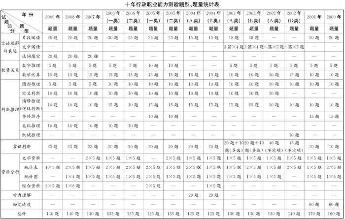 我们首先对以往十年行政职业能力测验的题型与题量分布情况.通过表格形式做一下介绍: