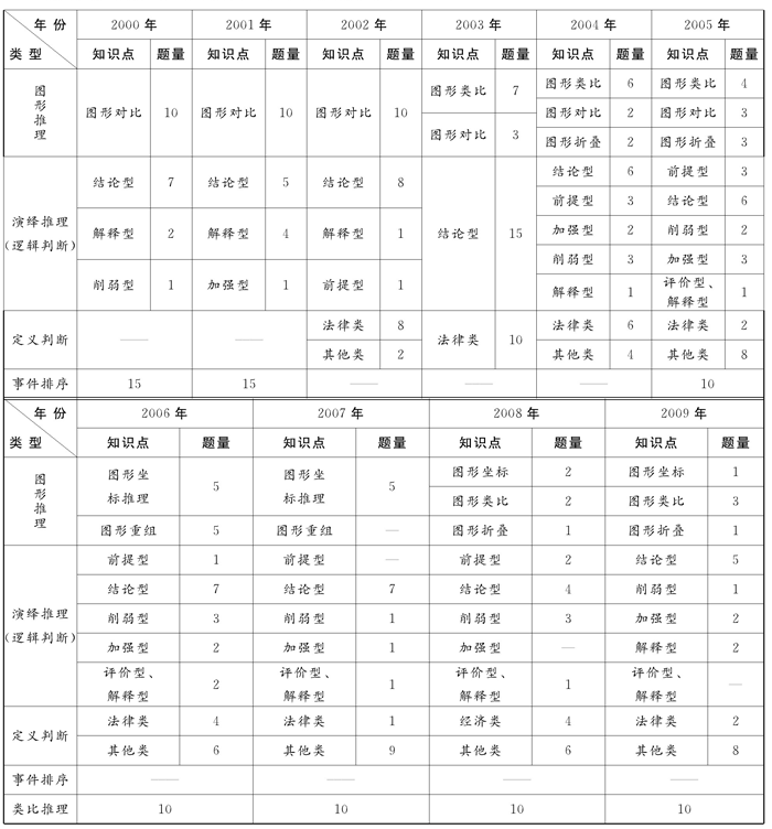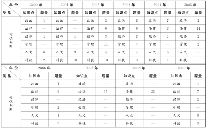 从上面的表格中我们可以看出,从2000年至今常识判断部分在整体上的变化有三:第一,在题型的设置上,取消了多项选择题和不定项选择题。在2002年和2003年,常识判断部分曾出现过多选和不定项的题型,但从2004年以后,这两类题型就没再出现。常识部分的题型已固定下来,即仅以单项选择题的形式出现。第二,考查知识点的深度降低,但知识面扩大。虽然在某一单一领域不会出现专业性太强、难度太大的试题,但常识判断部分整体涉及的知识范围相当广泛,不但包括政治、法律、经济、科技等 相关知识,还经常出现对新闻时事、地理、历史等知识的考查题目。第三,加大了对法律知识的考查力度。尤其在2007年和2008年,常识判断部分的25道题均为法律常识题,虽然2009年常识部分放弃了单一性地考查法律常识的出题模式,但不可否认,法律常识仍是这一部分的重点所在。
