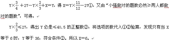 【解析】D。设都没做完的题目共有X道,题目总数为Y道,则“小明做对的+小强做对的-他俩都做对的+他俩都做错的=总题数”,即: