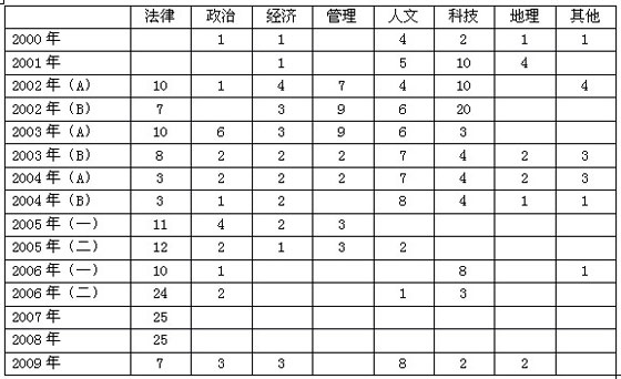 注:根据09年考试大纲,常识部分涵盖法律、政治、经济、管理、历史、自然、科技等方面,侧重考查应试者的法律知识运用能力。因此,人文相应地替代为“历史”与“自然”。
