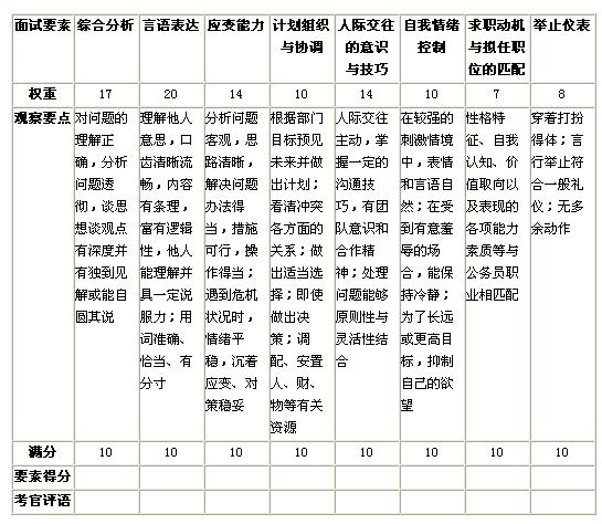 六、考官要按照各测评要素的评分标准进行打分。见下表。