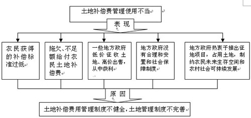 其次,通过对上述问题的原因的查找,就可以发现地方政府土地补偿费用管理制度不科学不健全是造成上述问题的主要原因。具体分析过程如下图: