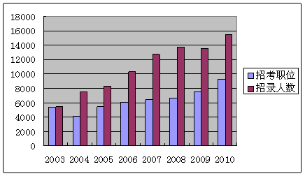 从上表中可以看出,2003年共有5400个招考职位,招录5475人,基本上是“一个萝卜一个坑”。到了今年,招录职位已经扩充到了9275个,招录人数也达到了15526,招录职位将近是2003年的2倍,招录人数是2003年的3倍,职位与人数的比例达到了1:1.67,这一比列大大超过2003年的比例。