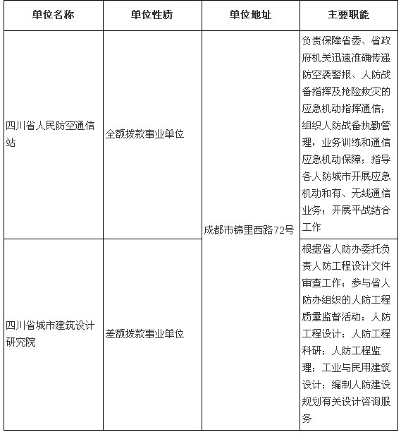 根据《四川省省属事业单位公开招聘工作人员实施细则(试行)》的有关规定,四川省人民防空办公室拟公开招聘部分工作人员补充到四川省人民防空通信站、四川省城市建筑设计研究院等2个直属事业单位工作。