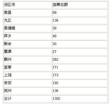 2010年江西省选聘高校毕业生到村任职名额分配表