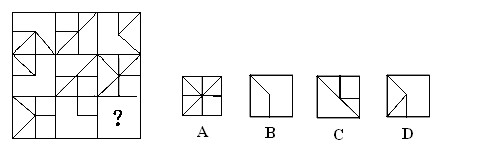 (解答:每行前两个图形叠加后,不同的部分就是第三个图形。正确答案是D。)