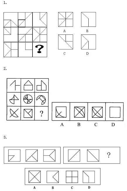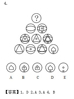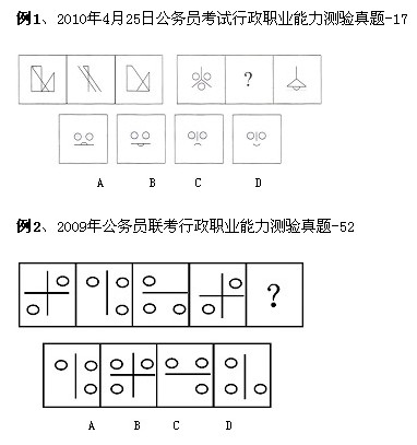 【解析】这两题虽然形式不同,但有一点,图形的组成很相似。相似图形间是怎样变化的?很容易发现,前两个图叠加,相同的部分消去,不同的部分保留,也就是去同存异。但2010年2010年4月25日公务员考试17题比2009年公务员联考的52题更容易判断推理路线,这两题的答案都是A。
