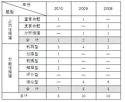 削弱型题目几乎每年都是考试的重点,在题量上稳中有升。而结论型题目在2008年和2009年大量出现后,在2010年甚至没有考查。之前很少出现的加强型、前提型、解释型题目,2010年都有涉及。