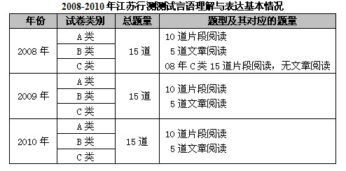 由上表我们可以看出,江苏省言语理解与表达题型的考查相对稳定,三年均为片断阅读、文章阅读,且题量一直保持在15道。