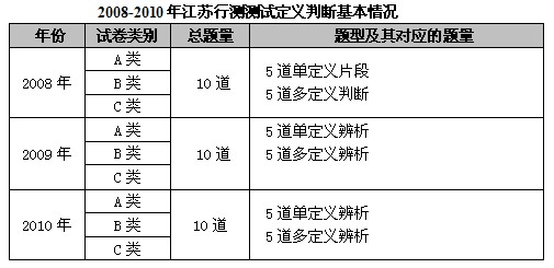 总的来说,定义判断题的难度并不大,老师预计2011年江苏公务员考试定义判断题会继续保持在10道,单定义与多定义题目各占一定的题量,难度和考查范围都会有所增加。