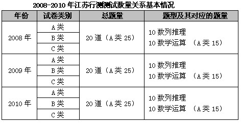1.题量稳定,题型多变 近三年江苏公务员考试行测(A、B、C三类)测试数字推理一直稳定在10道,老师预计今后题量不会改变;难度会适度增加。