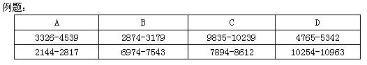 第二类题目:先呈现出一个数字区间表格,在随后的题目中,每一道题都给出一个数字,要求考生将这一数字与表格中的数字区间进行比较,判断这一数字位于哪一个区间,这一数字区间所在的标号字母为正确答案。