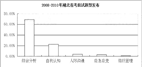 湖北公务员面试以结构化面试形式为主,包括自我认知、人际沟通、组织管理、应急应变和综合分析等基本题型。根据对2008年―2010年 湖北公务员面试的真题进行分析,可得出湖北公务员面试题目类型分布如下: