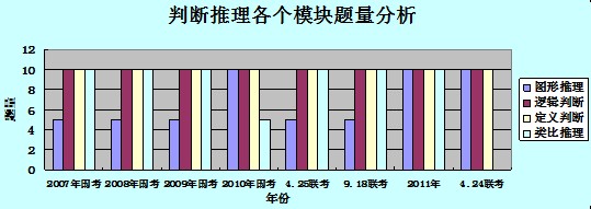 从上图分析可知,图形推理:2007-2009年5道题,但从2010年一直上升至10道;逻辑判断、定义判断:一直是10道题目没有改变;类比推理:之前大部分都是10道题目,但是近来的424联考却取消了这个模块的考查。总之,图形推理模块的比重有所增加,逻辑判断、定义判断保持不变,类比推理有所下降。
