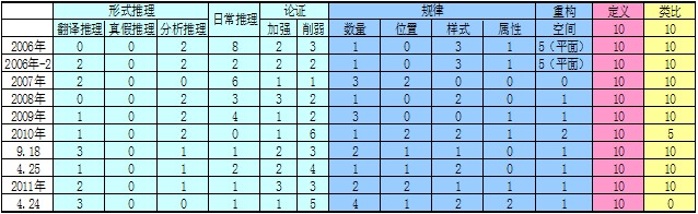 从上图可以分析出:判断推理模块在2010年的考试中有所上升,从以前的0.25上升到0.3,虽然刚刚不久的424联考中考察比重又回到0.25,但是比重上升的趋势不可忽视。