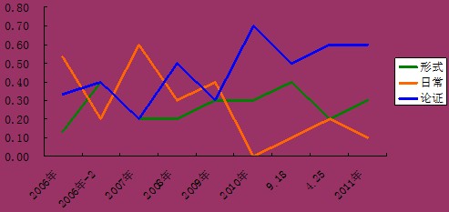 从上图中可知,论证模块呈上涨的趋势,特别是削弱类题目,有些年份高达7道题目;其次形式推理基本考察3-4道题目,比较稳定;日常推理相对简单,比重偏少。