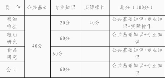 笔试分公共基础知识(占笔试成绩的40%)和专业测试(占笔试成绩的60%,粮油检验岗位加考实际操作)两部份。笔试成绩设最低分数控制线50分,低于50分者不得参加面试。