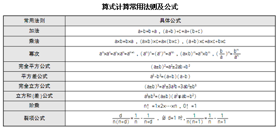 加法和乘法的相关法则非常简单,平时都会用到,这里列举出来,大家只需要理解其含义。幂次和运算公式的相关法则,在公务员考试中使用比较频繁,需要重点记忆。