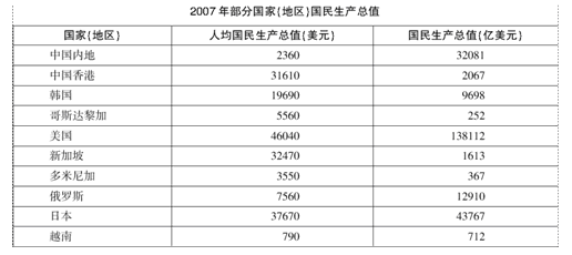 本题答案选A。由表格可知,人均国民生产总值排在前五名的国家(地区)分别是美国、日本、新加坡、中国中国香港、韩国;