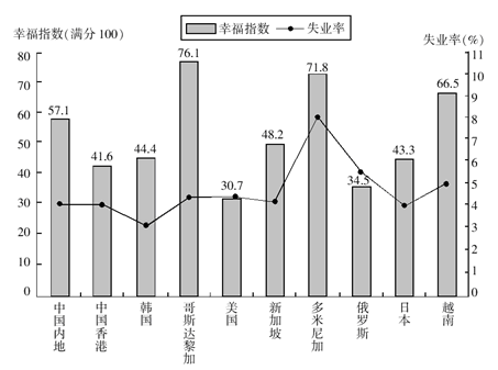 ③比中国内地失业率低的国家(地区),幸福指数均低于中国内地
