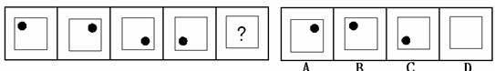 (答案:B。黑点在正方形中顺时针移动。在第5个图形中,应该正好移动到左上角。)