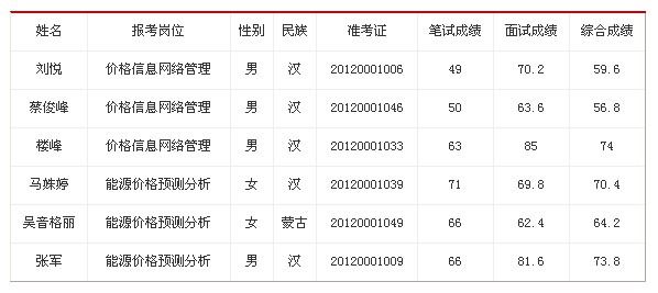 新疆维吾尔自治区发展改革委价格监测中心2012年面向社会公开招聘专业技术人员笔试、面试工作已完成,体检时间另行通知。现将综合成绩公示如下: