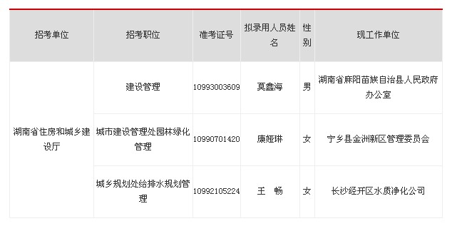2012年湖南省住房和城乡建设厅公务员录用名单