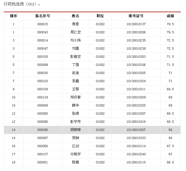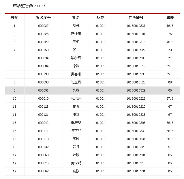 根据《省工商局公开遴选公务员公告》,按笔试成绩从高到低的顺序以及面试和遴选职位6:1的比例,周丹、高佳雨、王凯、张一、陈孝辉、涂岚、吴春琳、刘亚丹、吴霜、郭承亮、崔莹、邓莽、朱清华、陈正然、蔡玲、韩丹、叶敏、黄令明、余黎等19人进入市场监管岗(001)职位面试,商景、周仁宏、刘小玮、刘?、彭继宏、丁强、赵迪、李鑫、王黎、郑庆春、薛华、张琪、彭宇芳、胡婷婷、贺娴、江剑、付晓宇、陈茜等18人进入行政执法岗(002)职位面试。请上述考生在12月15日上午面试前将身份证、准考证、纸质遴选报名登记表、诚信承诺书、学历学位证书、工作经历证明等材料原件及公务员登记表复印件(复印件上需加盖单位人事部门红章)交候考室工作人员。