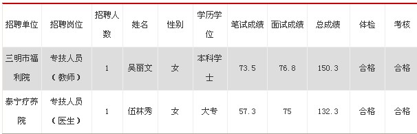 经研究,拟招聘吴丽文同志为三明市福利院工作人员、伍林秀同志为泰宁疗养院工作人员。