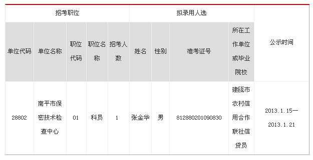 现根据《2012年福建省秋季考试录用公务员公告》及南平市招考简章要求,陆续对考试、体检、考察合格拟录用国家公务员和参照公务员法管理机关(单位)工作人员名单进行公示(具体公示期见表格),在此期间欢迎广大群众以来信来电来访的形式实事求是反映情况,接待(来信投递)科室:南平市委组织部干部三科,联系电话:8823008。