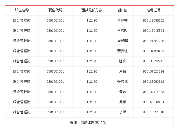 根据考生笔试和面试综合成绩,由高分到低分确定考察对象,考察人选与录用计划比例为1:1。