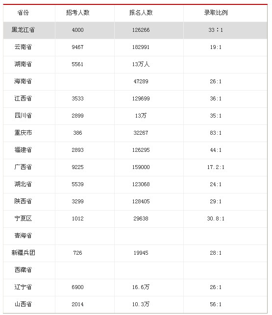 据统计,2012年上半年公务员联考时间为4月21日,全国共17个省份联合举行。山西、辽宁、黑龙江、福建、湖北、湖南、广西壮族自治区、海南、四川、重庆、云南、西藏自治区、陕西、甘肃、青海、宁夏回族自治区和新疆生产建设兵团参加联考。据相关统计信息显示,此次联考涉及考生超过114万人。下图为17省市公务员报考人数及考录比统计,考生可参考其相关数据。