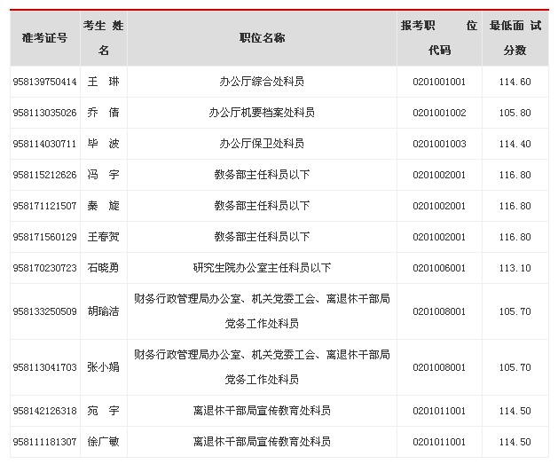 根据中组部、人力资源社会保障部、国家公务员局关于公务员考录递补工作的有关规定,部分考生因个人原因放弃或被取消面试资格,按照考生成绩从高到低递补的原则,经报中央公务员主管部门同意,递补以下11名考生参加面试: