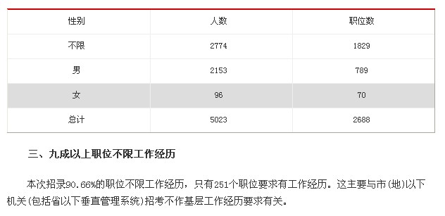 本次招录明确提出要求招录男性2153人,占到总人数的42.8%;主要集中在公安系统、法院系统和检察系统,该系统因工作环境和条件更适合男性。