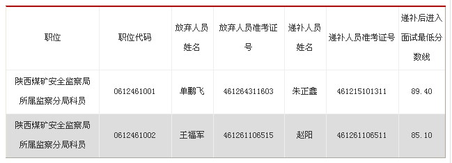 2013年面试人员递补公告:陕西煤矿安全监察局