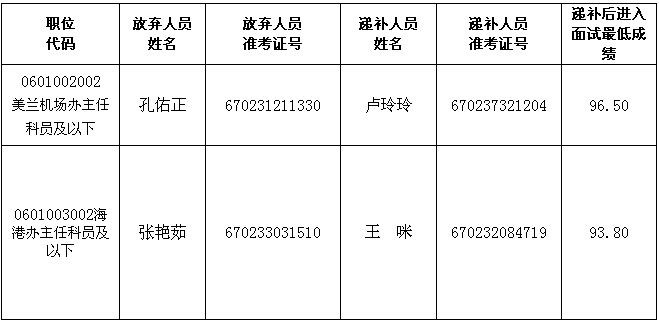 因部分进入面试考生放弃面试资格,根据有关规定,我局在报考该职位公共科目笔试成绩合格的考生中,按照成绩由高到低的顺序进行递补。递补人选如下: